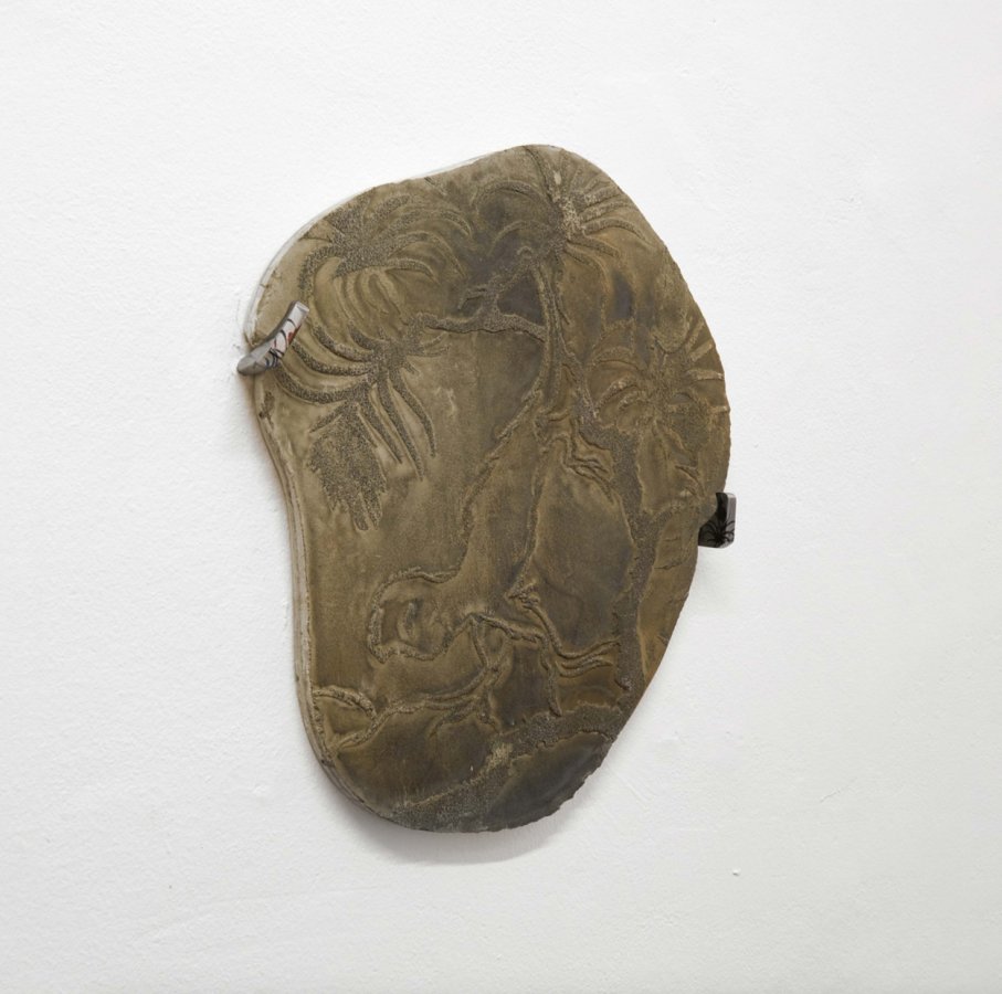 Stanislav Zábrodský, Three times in Ethernia, 2022, ceramic relief, paracord, basalt stone, 55 x 40 cm